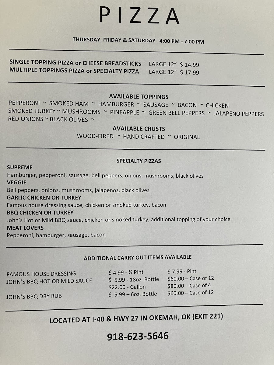 In short, John's Bar-B-Q offers a solid range of smoked meats, classic sides, and unexpected delights like BBQ-inspired pizzas - all centered on delivering big flavor in a casual, satisfying setting.