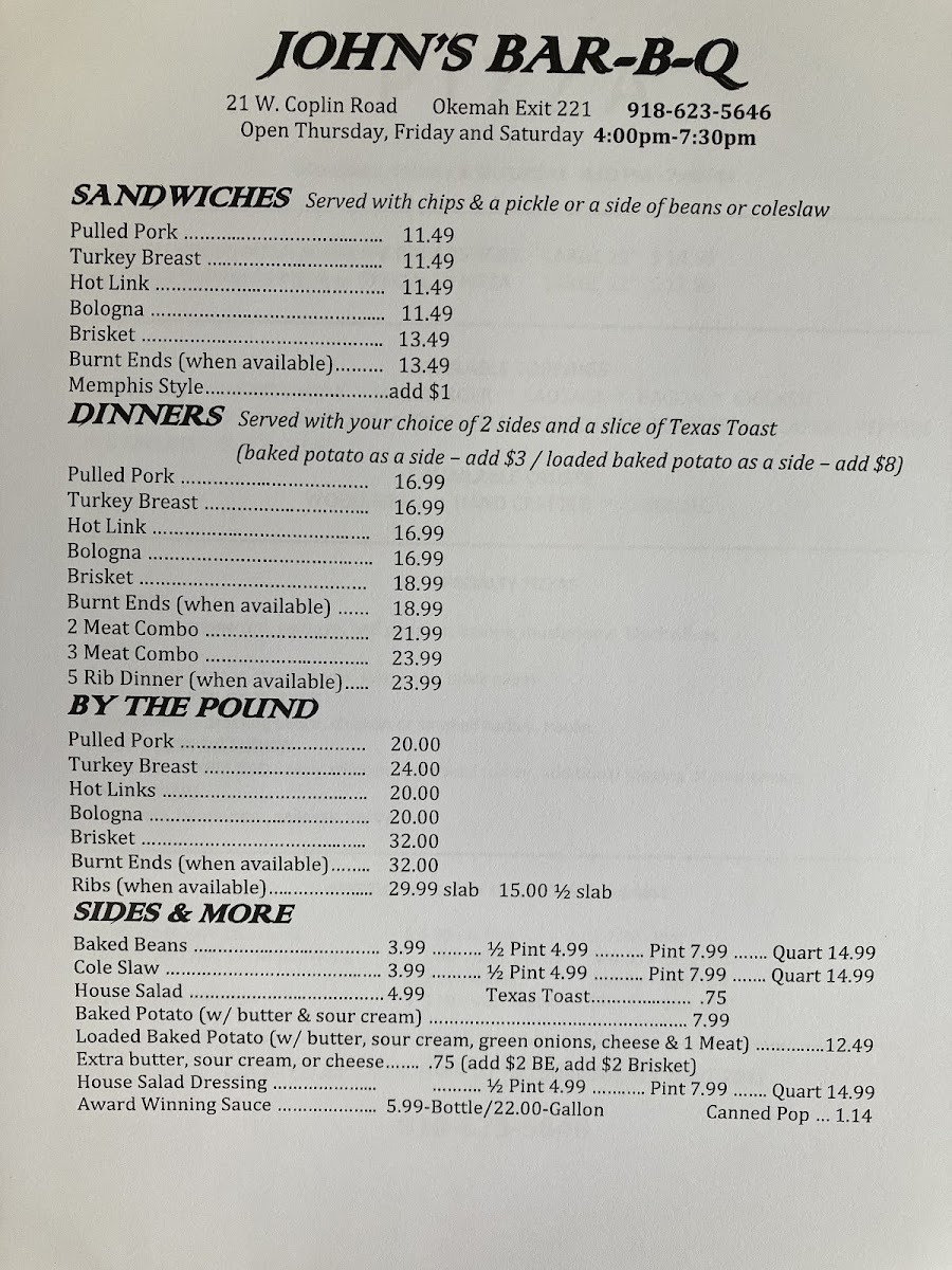 John's Bar-B-Q at 21 W Coplin St, Okemah, OK delivers a hearty and no-nonsense Southern BBQ experience through a menu packed with smoked classics and crowd-pleasers. Whether you're dropping by for a quick bite or a full dinner plate, there's something here for every BBQ lover. The Sandwiches section is loaded with smoky favorites like Pulled Pork, Turkey Breast, Hot Link, Bologna, and Brisket - each one offering rich, savory flavor and tender textures that speak to authentic slow-cooked craftsmanship.